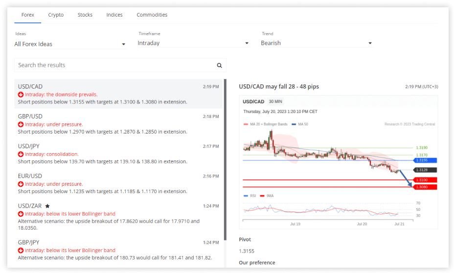 Reduce the amount of time spent conducting manual market research and technical analysis. Trading Central will scan the markets on your behalf and deliver trade ideas directly to you.